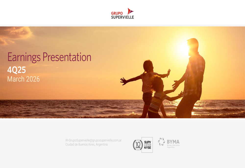 Grupo Supervielle S.A., a financial services holding company, provides various banking products and services in Argentina. The company operates through Personal & Business Banking, Corporate Banking, Bank Treasury, Insurance, and Asset Management and Other Services segments. It offers savings and checking accounts, and time deposits; personal, mortgage, unsecured, and car loans; overdrafts; loans with special facilities for project and working capital financing; and leasing, bank guarantees for tenants, salary advances, domestic and international factoring, international guarantees and letters of credit, payroll payment plans, and credit and debit cards, as well as financial services and investments, such as mutual funds, guarantees, and benefit payments for senior citizens. The company also provides foreign trade and cash management; advisory services; treasury services; insurance products comprising life, home, personal accidents, technology, ATMs, protected bag and content, and integral insurance product for entrepreneurs and SME customers and other insurance policies; and asset management and other services, as well as operates as a digital online broker. It operates through a network of branches, ATMs, and self-service terminals. The company was formerly known as Inversiones y Participaciones S.A. and changed its name to Grupo Supervielle S.A. in November 2008. Grupo Supervielle S.A. was founded in 1887 and is based in Buenos Aires, Argentina.