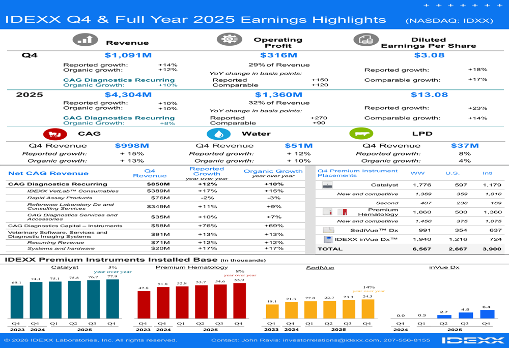 IDEXX Laboratories, Inc. develops, manufactures, and distributes products for the companion animal veterinary, livestock and poultry, dairy, and water testing industries in the United States and internationally. It operates through three segments: Companion Animal Group; Water Quality Products; and Livestock, Poultry and Dairy. The company offers point-of-care diagnostic solutions, blood and urine chemistry, hematology, immunoassay, urinalysis, cytology/morphology, and coagulation analyzers; and SNAP rapid assays test kits. It also provides commercial reference laboratory diagnostic and consulting services to veterinarians; veterinary consultation, telemedicine, and advisory services, including radiology, dental radiography, cardiology, internal medicine, and ultrasound consulting; Colilert, Colilert-18, and Colisure tests, which detect the presence of total coliforms and E. coli in water; Enterolert, Pseudalert, Filta-Max and Filta-Max xpress, Legiolert, Quanti-Tray products, and Tecta system instruments; UV Viewer Plus, a UV light cabinet which aids in the visual interpretation of fluorescent-based water tests; and veterinary software and services for independent veterinary clinics and corporate groups. In addition, the company offers diagnostic tests, services, and related instrumentation to manage the health status of livestock and poultry; human medical diagnostic products and services; and VetConnect PLUS, a cloud-based technology that enables veterinarians to access and analyze patients, as well as operates VetLab Station. It markets its products through marketing, customer service, sales, and technical service groups, as well as through independent distributors and other resellers. IDEXX Laboratories, Inc. was incorporated in 1983 and is headquartered in Westbrook, Maine.